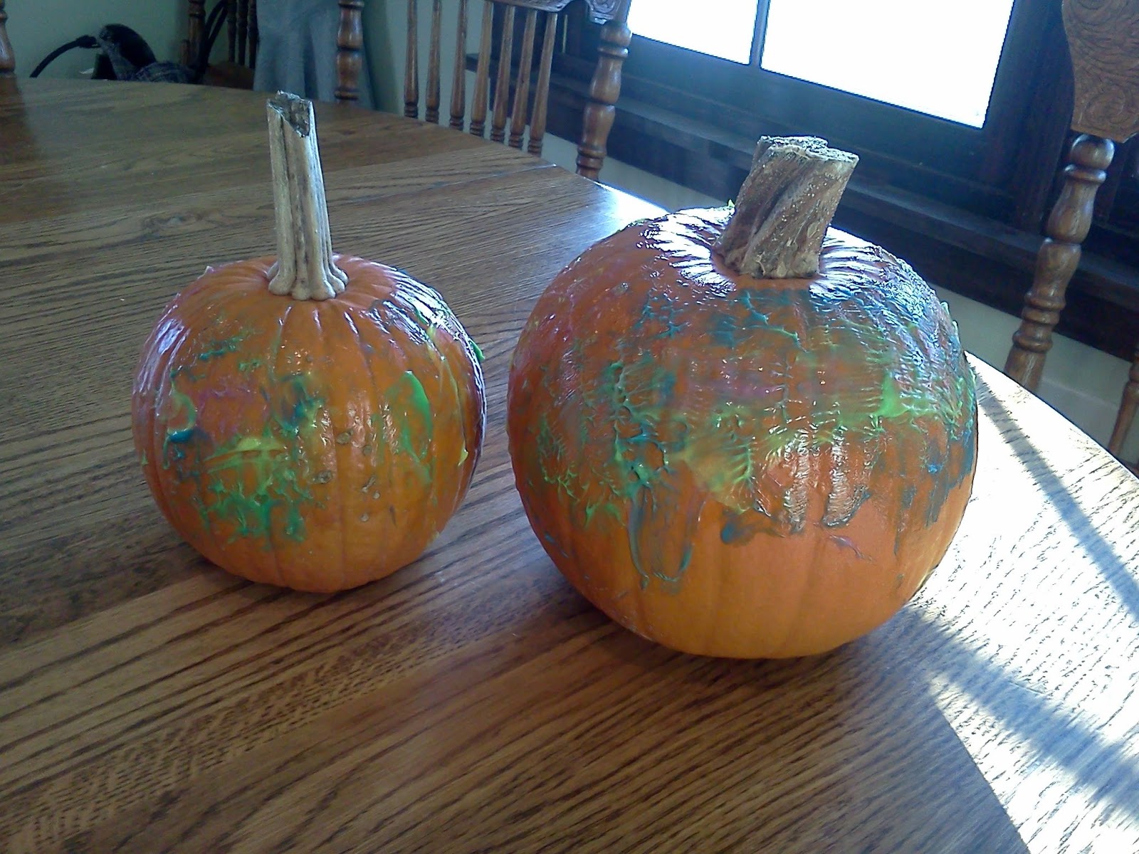 One of our other pumpkin projects was pumpkin painting. The Following pictures are of our adventures in doing this. (note, I used some glow in the dark finger paint that I got as a gag gift several years ago, it didn't dry properly, but does glow nicely.)
